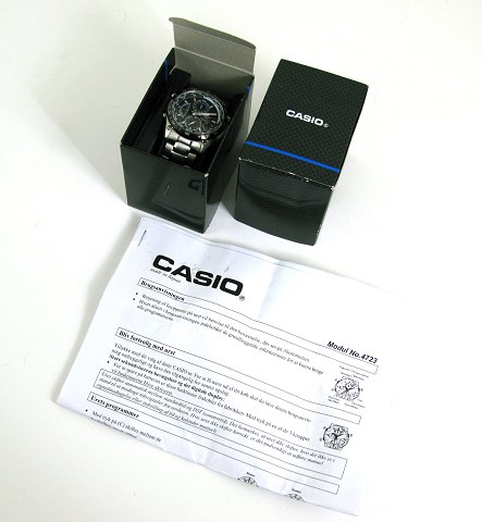 Casio Twin Chronograph herrearmbåndsur, ref. 910108 i urkasse og med lænke af stål. Sort skive med stregindikation, digital og central sekundviser og dobbelt chronograph funktioner. Quartsværk. Urkasse diameter 42 mm. Salgsæske, manualer og certifikat fra 10/2012 medfølger.