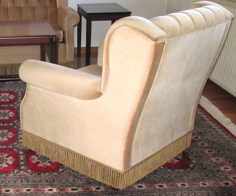 Komplet salon far 1950'erne bestående af 3-personers sofa, 2 lænestole, 2 lampeborde samt salonbord af mahogny.