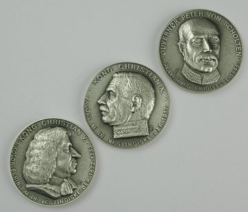 Medaillesæt af sterling sølv med tre forskellige medailler St. Thomas - St. Juan og St. Croix. Revers portræt af Peter von Scholten - Christian V og Christian X. Diam. 40 m. Samlet finsølvindhold 92 gr.