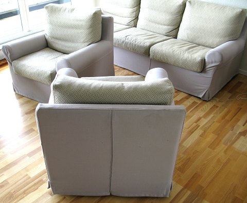 Salon af høj kvalitet bestående af en tre personers sofa, L. 215 cm. x D. 95 cm. x Sædehøjde 76 cm. Lænestole H. 83 cm. x D. 93cm. x sædehøjde 76 cm.