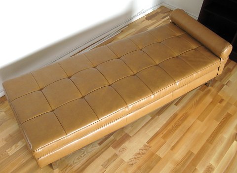 Chaiselong med dobbeltmadras og puf, betrukket med lysebrunt kunstlæder. Stel af forkromet metal. L. 200 cm., B. 75 cm., H. 40 cm.