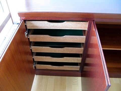 Velholdt, trefløjet anretterskænk af mahognyfiner med 3 hængslede døre samt sektion med bestikskuffer. L. 155 cm. x H. 82 cm. x B. 48 cm.