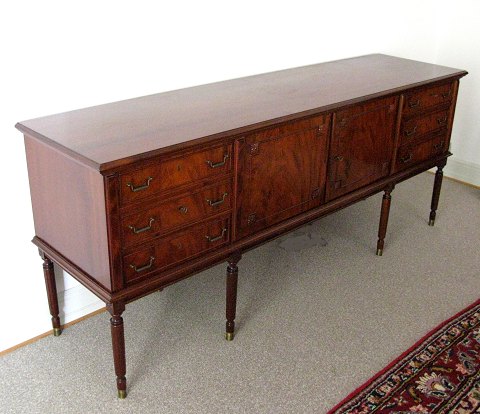 Hepplewhite spisestue bestående af spisebord med 3 originale og en ekstra tillægsplade, samt 6 tilhørende stole, skænk, vitrine og butlers tray på hjul. Spisebord 175 cm. med en tillægsplade x H. 75 cm., plus 2 originale mahogny tillægsplader á 50 cm., samt tillægsplade 50 cm., totallængde 325 cm. Skænk med tre skuffer i hver side samt dobbeltlåge midtfor, 220 x 90 x 56 cm. Hjørne vitrineskab H. ca. 170 cm. Butlers tray på hjul 50 x 70 cm.