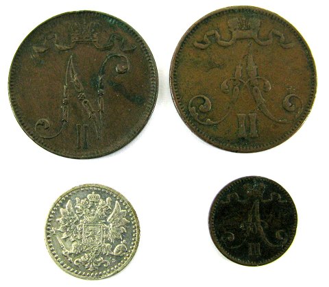 Suomi, Finland 25 Penniä 1869 sølv, 2x 5 Penniä 1873 og 1899, 1 Penni 1891. (4)