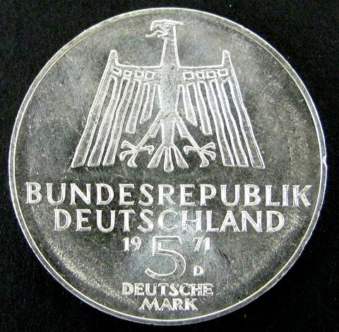 Tyskland, 5 Mark, Sølv, 1971 D, KM 129