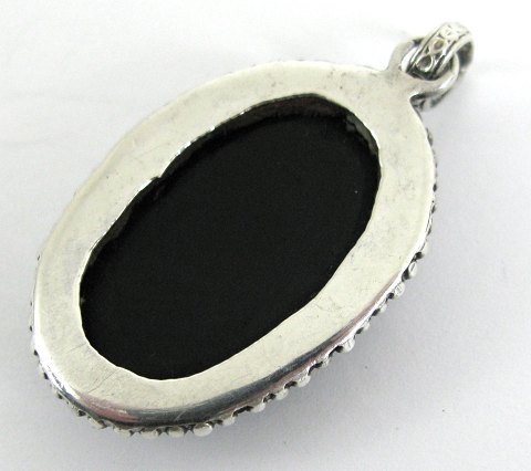 Vedhæng af sølv, prydet med større, chabochonslebne onyx, 32 x 21 mm. Vedhæng L. 48 mm. Utydelig stemplet.