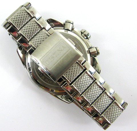 Festina chronograph herrearmbåndsur i urkasse og med struktureret lænke af stål. Sort skive med central sekundviser, stregindikation, dag og datovisning i #4 positionen, chronograph funktioner. Quartsværk. Urkasse diameter 46 mm.