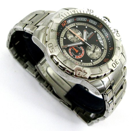 Festina chronograph herrearmbåndsur i urkasse og med delvist matteret lænke af stål. Sort/metalgrå skive med stregindikation, datovisning i #4 positionen, chronograph funktioner. Quartsværk. Urkasse diameter 42 mm.