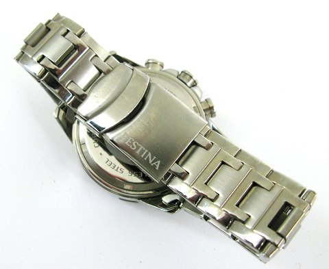 Festina Chronograph herrearmbåndsur i urkasse og med lænke af stål. Sort/blå struktureret skive med separat sekundviser, stregindikation, datovisning i #4 positionen og chronograph funktioner. Quartsværk, urkasse diameter 44 mm.
