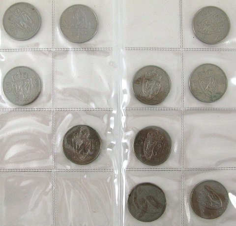 Norge, samling årgangsmønter 1, -2, -5, -10, -25, -50 øre samt kr og 5 kr
