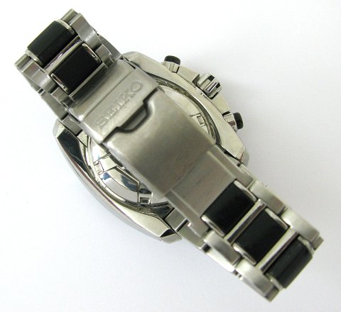 Seiko Velatura Chronograph herrearmbåndsur i urkasse og med struktureret lænke af stål, ref. nr. 870890, sort skive med punktindikation, central og separat sekundviser, datovisning i # 4½ positionen, chronographfunktioner. Quartsværk. Urkasse diameter 48 mm.