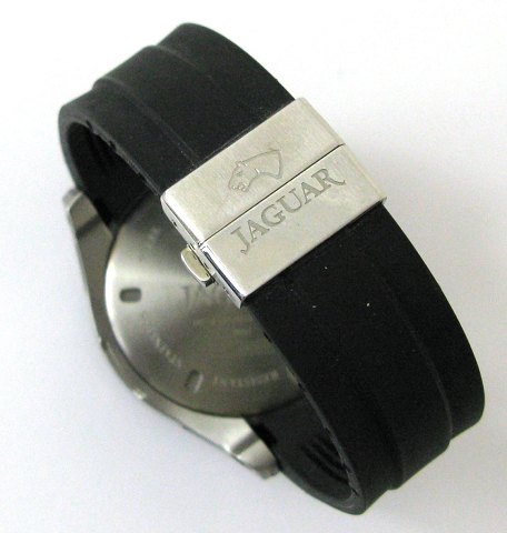 Jaguar herrearmbåndsur, model J651, limiteret udgave nr. 0875 af i alt 3000 stk. Sort struktureret skive med pilindikation, separat skivesekundviser og datovisning i #12 positionen, chronographfunktioner. Quartsværk. Urkasse diameter 45 mm. Gummirem med metalspænde.