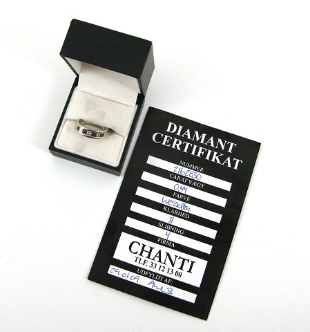 Chanti ring af 14 kt. hvidguld, prydet med tre flotte, facetslebne rubiner samt tre brillantslebne diamanter, Wesselton Si på tilsammen 0,44 ct. ifølge det medfølgende certifikat. Ring Str. 52½, vægt 4,3 gr.