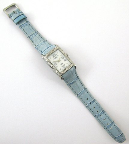 Raymond Weil damearmbåndsur, ref. nr. 5981 i rektangulær urkasse med perlemor skive bag safirglas, romertal og stenbesatte punktindikationer, datovisning i #4 positionen. Ramme ligeledes belagt med små sten. Quartsværk. Lyseblå kroko imit. læderrem med metalspænde. Urkasse 23 x 28 mm.