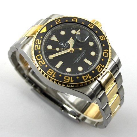 Herrearmbåndsur fra Rolex, model GMT-Master II, ref.nr.: 116713, Z-serie, i kasse og m. oysterlænke af 18 kt. guld og stål, guldlynette m. keramisk rand, sort skive m. punkt- og stregindeks, datoangivelse ved 3" position, safirglas, automatisk urværk. Fra 2008. Ø. 40 mm.