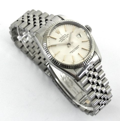Rolex Datejust herrearmbåndsur i urkasse med krans af hvidguld og med "jubilee" lænke af stål. Metalfarvet urskive med stregindikation, central sekundviser og datovisning i #3 positionen. Automatisk værk. Urkasse diameter 36 mm.
