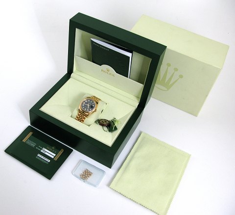 Rolex Datejust herrearmbåndsur, ref. nr. 116238 i urkasse og med lænke af 18 kt. guld. Sort struktureret skive bag safirglas med arabertal, central sekundviser samt datovisning i #3 positionen. Automatisk værk. Urkasse diameter 37 mm. Certifikat medfølger 11-2010