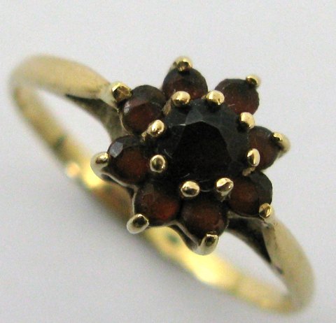 Rosetring af 14 kt. guld, prydet med større, mørk granat, omkranset af 8 mindre, lysere granater. Ring str. 53