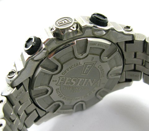 Festina chronograph herrearmbåndsur i urkasse og lænke af stål. Ref. nr. F16542 med metallic blå skive, streg- og talindikation, separat sekundviser, datovisning i #3½ positionen og chronograph funktioner. Quartsværk. Urkasse diameter 48 mm.
