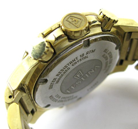 Festina chronograph herrearmbåndsur, ref. nr. F16188/08 i urkasse og med lænke af guldtonet stål. Sort skive med central sekundviser, stregindikation, datovisning i #4 positionen, chronograph funktioner. Quartsværk. Urkasse diameter 44 mm.