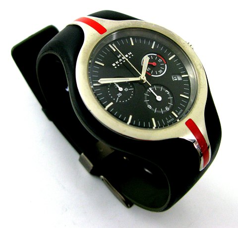 Skagen chronograph armbåndsur i urkasse af stål med lænke og urkasse indfatning af gummi. Sort skive med stregindikation, central sekundviser og chronographfunkitoner. Quartsværk. Urkasse diameter 40 mm.