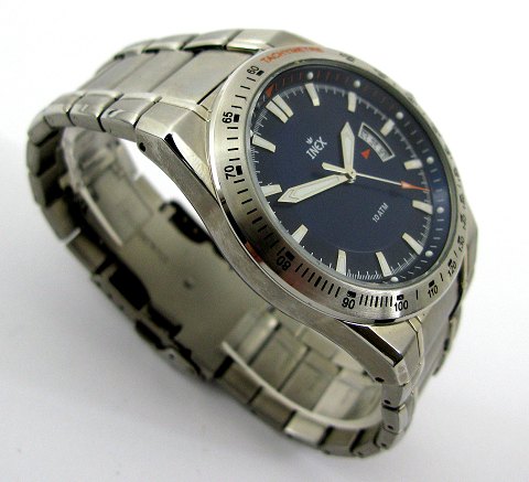 Inex herrearmbåndsur i urkasse og med lænke af stål. Hvid skive med stregindikation, central sekundviser og triple datovisning i #3 positionen. Quartsværk. Urkasse diameter 43 mm.