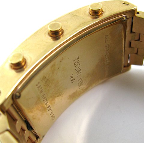 Techno Com armbåndsur i urkasse og med lænke af guldtonet stål. Stenbesat skive og firedelt urkasse med visning af lokaltid samt tid for London - Tokyo - L.A og N.Y.