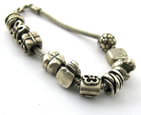 Pandora armlænke, prydet med 10 charms i form af mobiltelefon, svane, roset, flodhest, firekløver, gavepakke, blomst med pink sten samt tre tøndecharms. Lænke L. 18 cm., samlet vægt 49,5 gr.