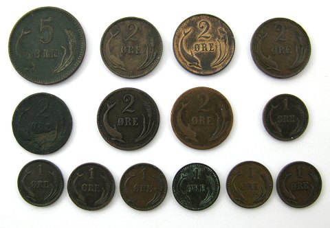 Chr. IX, samling 5 øre, 2 øre og 1 øre - diverse årstal (14)