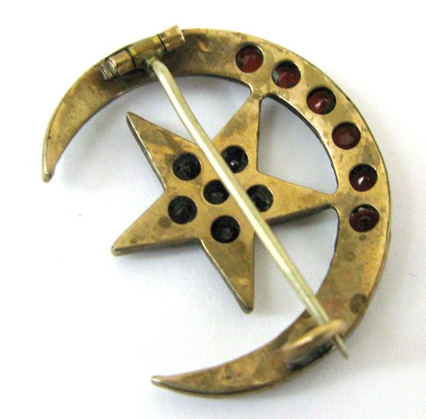 Orientalsk granatbroche i form af halvmåne med stjerne, besat med talrige, facetslebne granater. 30 x 25 mm.