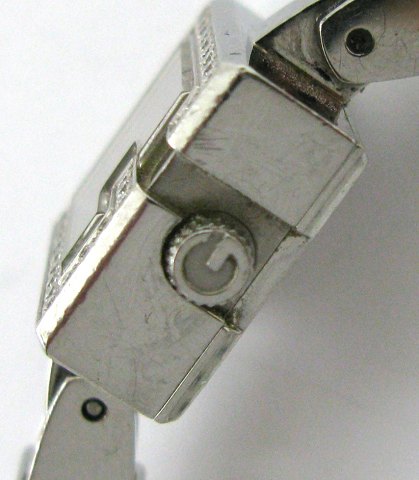 Gucci damearmbåndsur i G-logoformet urkasse af stål med perlemorskive. Logokrans prydet med 32 brillantslebne diamanter Wesselton Vs, tilsammen 0,16 ct. Quartsværk. Urkasse 13 x 13 mm. Nypris kr 11.650.-