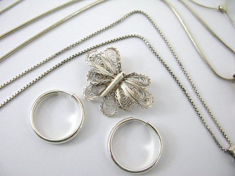 Lot bestående af halskæde med massiv vedhæng , L. 42 cm., Halskæde med moderne aflangt vedhæng, prydet med tre sten, kæde L. 40 cm., Halskæde med stjerneformet vedhæng, prydet med sten, par creoler øreringe, diameter 20 mm. samt filigran sommerfugl på 37 x 26 mm. Samlet vægt 22 gr.