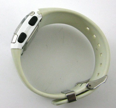 Lorus damearmbåndsur i urkasse af forkromet og hvid metal med digital tidstagning samt visning af dag, dato m.v. Quartsværk. Urkasse 36 x 33 mm. Hvid gummirem med metalspænde.