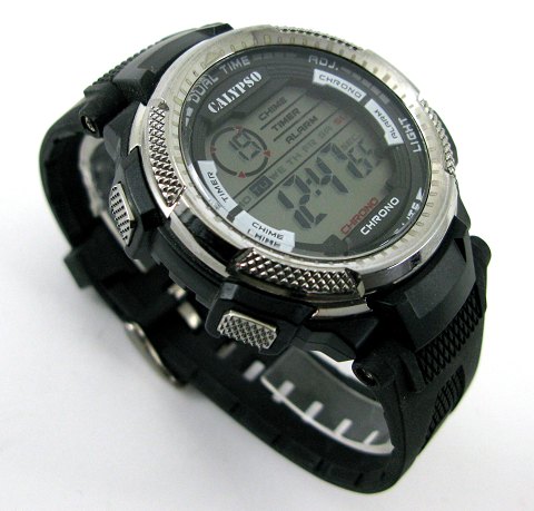 Calypso digital Chrono herrearmbåndsur i urkasse af metal/kunststof og lænke af sort gummi med metalspænde. Digital tidstagning med chronograph og tidstagningsfunktioner. Quartsværk. Urkasse diameter 44mm. Et letvægts løbeur.