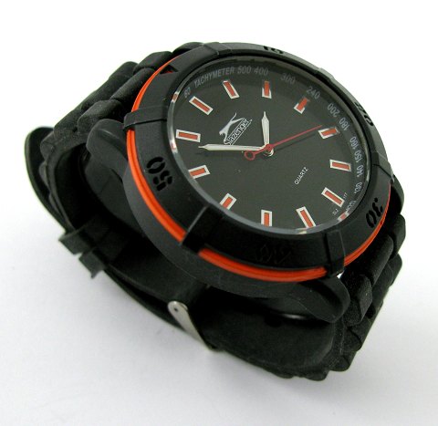 Slazenger SLZ 177 herrearmbåndsur i urkasse af stål med sort skive, stregindikation, central sekundviser. Quartsværk. Urkasse diameter 46 mm. Gummirem med metalspænde.