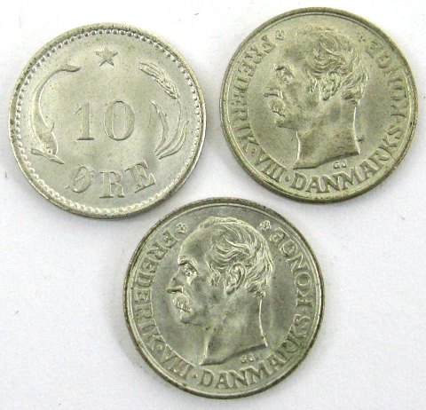 Chr. IX, 10 øre sølv 1903, -05 - Fr. VIII 10 øre sølv 1907 (3)