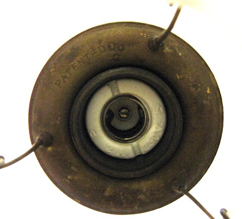 Poul Henningsen natbordslampe med erstattet rundt fodstykke og buet arm af messing, fatning af bakelit stemplet PH Lamp PATENTED. Trådben låsering stemplet PH 1-1 patented. Skærme af matteret glas, overskærm diameter 20 cm. Se lampens oprindelige form i bogen *Tænd* af Jørstian, m.fl., afbildet og omtalt side 188.