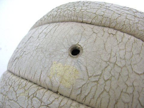 Ballonen indvendig i fodbolden er smuldret og bolden fremstår med aldersbetinget slitage.