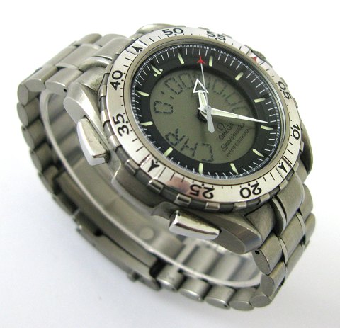 Omega Speedmaster X-33 Professional herrearmbåndsur, ref. nr. 3290.50.00 i urkasse og med lænke af titanium. Blankpoleret lynette, sort skivekrans med stregindikation og central digitalvisning af tid, dato, alarm og chronograph funktioner. Quartzværk. Urkasse diameter 41 mm., samlet vægt 110 gr.