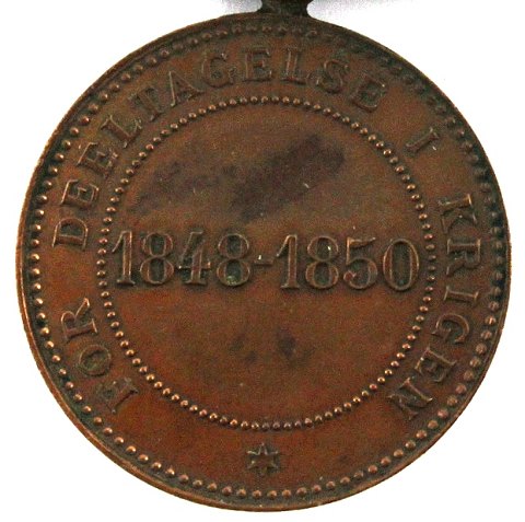Medaille for trofast tjeneste i krigen 1848-1850 med ordensbånd og nål. Medaille diameter 31 mm.