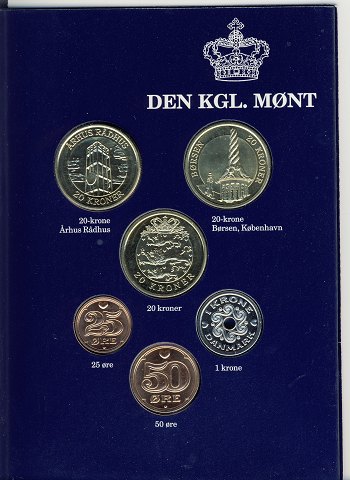 Indeholder 25 øre, 50 øre, 1 kr, 20 kr, 20 kr *Relief Aarhus Rådhus* og 20 kr *Børsen København*(Modelfoto)