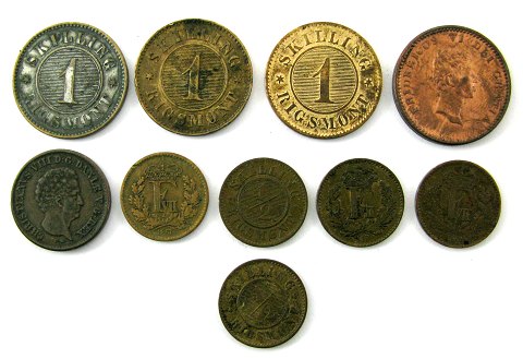 Lot bestående af 4x 1 Skilling rigsmønt, ½ R.B.S, 5x ½ Skilling rigsmønt - diverse årstal.