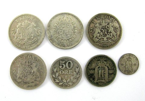 Sverige 1 kr sølv 1876, 1890, 1901, 1945, 50 øre 1875 og 1930 samt 10 øre 1884.