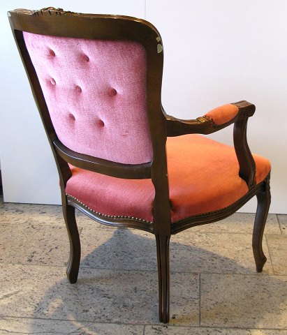 Skønvirke lænestol af mahogny med tidstypiske skæringer fra tiden omkring år 1910, betrukket med orangerød plys. Sæde H. 44 cm., ryg 82 cm.