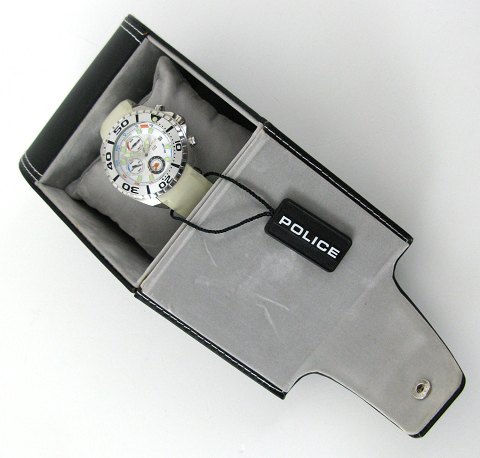 Police Time Pieces Chrono herrearmbåndsur, ref. 10659J i urkasse af stål med hvid skive, separat sekundviser, datovisning i #4 position samt chronograph funktioner. Quartsværk. Urkasse diameter 45 mm.. Hvid gummirem med metalspænde. Original opbevaringsboks medfølger.