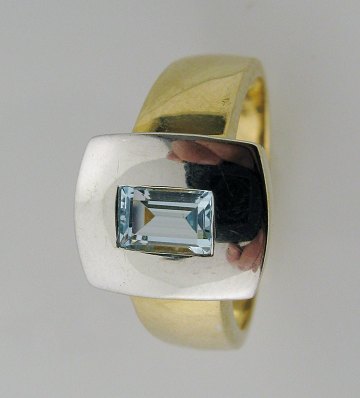 Ring af 14 kt. guld og rhodineret hvidguld, dekoreret med baguettesleben, aquamarinfarvet zirkonia. Samlet vægt ca. 5,6 gr., Str. 60.