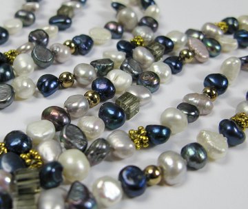 Halskæde monteret med perlemor, påfuglefarvede og kongeblå ferskvandperler, ca. 4 - 7 mm. hvorimellem forgyldte segmenter. L. Ca. 96 cm.