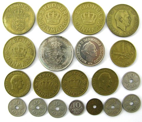 1 øre 1938, 10 øre 1920, -25, -26, -29, -31, -31, -37, 1 kr 1925, -26, -47, -47, -48, 2 kr 1925, -26, -40, -47, -51 10 kr 1986, 5 kr 1960 Sølvbryllup