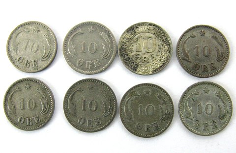 10 øre 1889, -91, -94, -97, - 99, 1903, -05 og -10 (8)