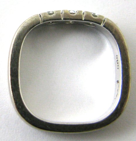 Ring af rhodineret hvidguld med ligesidet skinne, prydet med 3 brillantslebne diamanter på tilsammen ca. 0,25 ct. Ring Str. 50, vægt 4,4 gr.